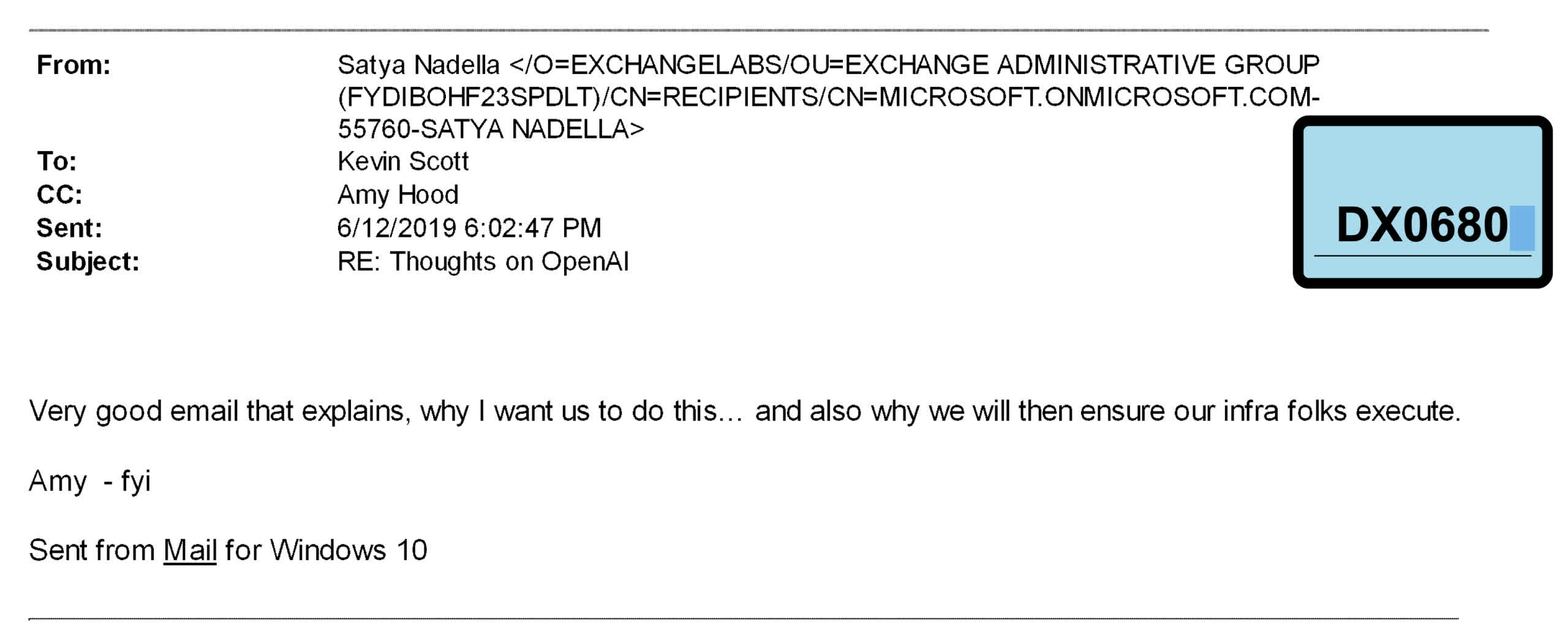 "Very good email that explains, why I want us to do this [invest in OpenAI]," Nadella replied while cc-ing Microsoft Chief Financial Officer Amy Hood in the June 2019 email. "And also why we will then ensure our infra folks execute."