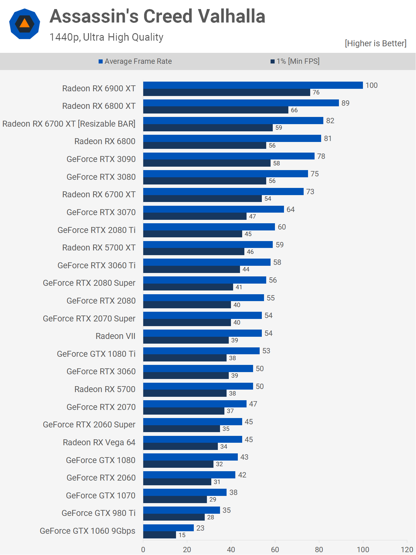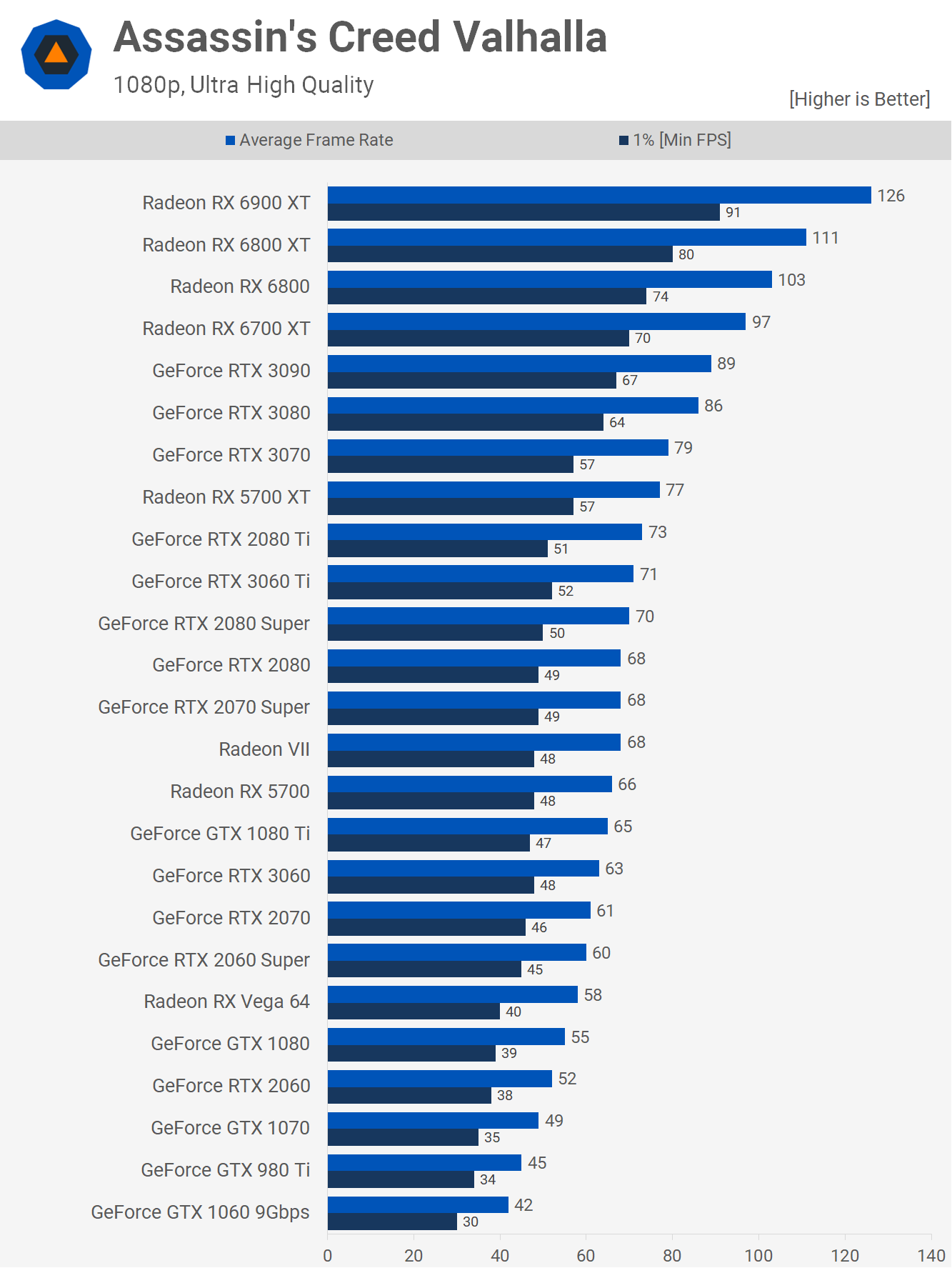 That said, it is only 14% slower than the RX 6800 and that's a good result as it means we could be looking at impressive performance in AMD-optimized titles, such as Assassin's Creed Valhalla. Speaking of which...