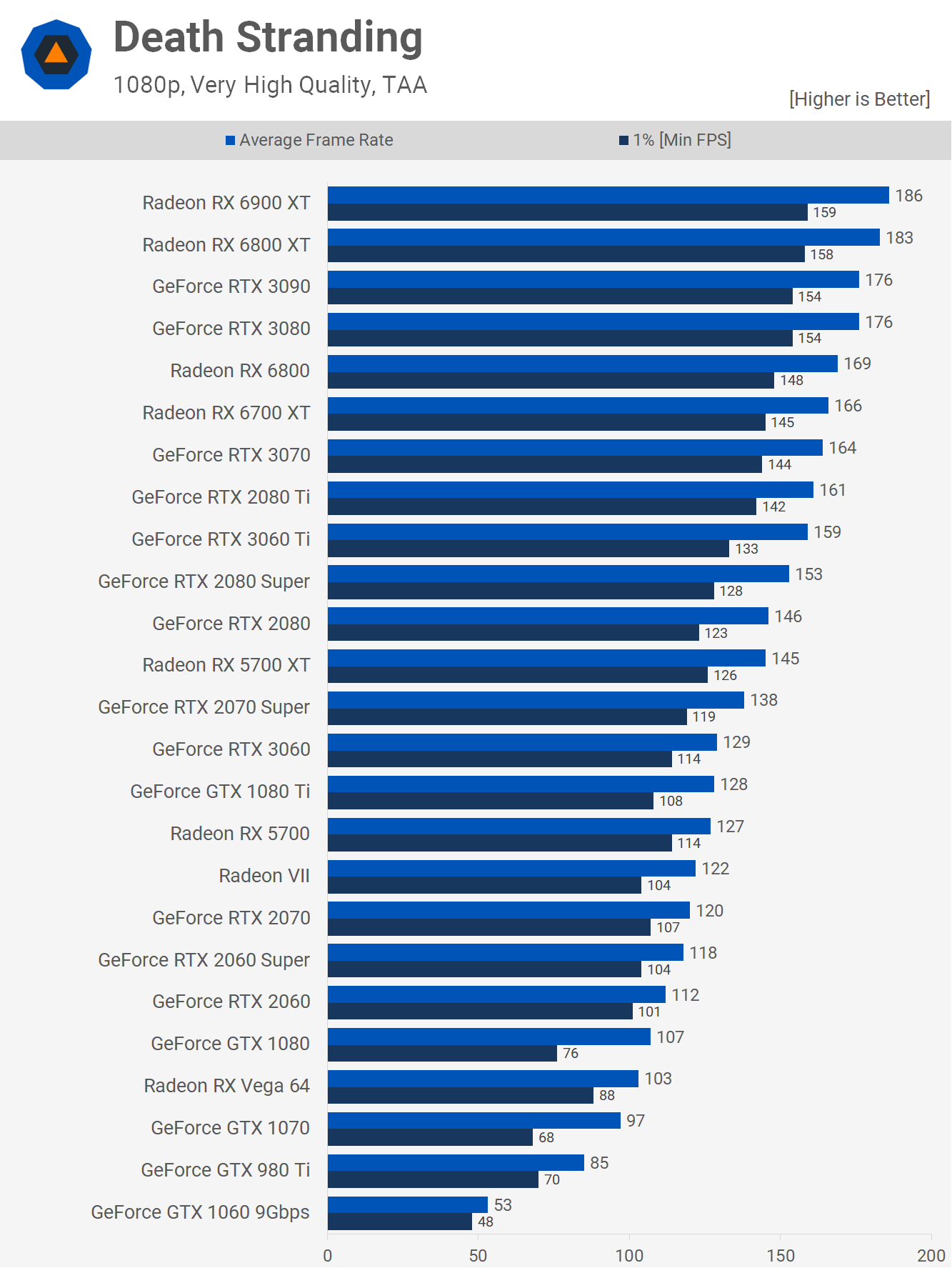 In Horizon Zero Dawn the 6700 XT finds positioned squarely between the RTX 3070 and 3060 Ti, but they're all so close it doesn't really matter, so let's call this one a tie. The 6700 XT is just 11% slower than the 6800 and 33% faster than the 5700 XT, so when compared to other Radeon products that's a decent result.