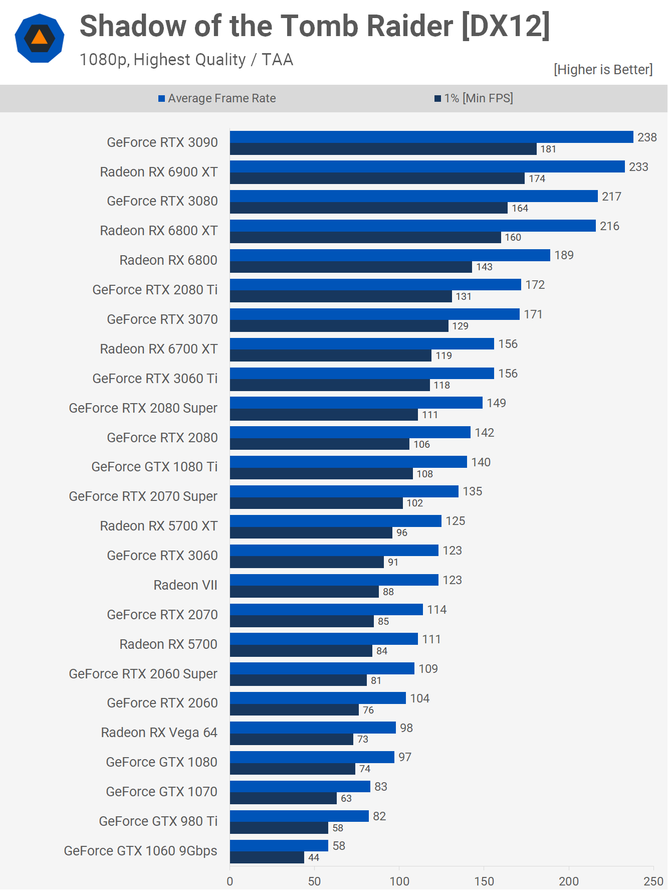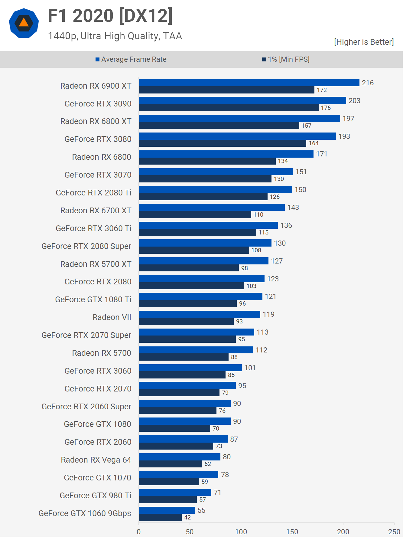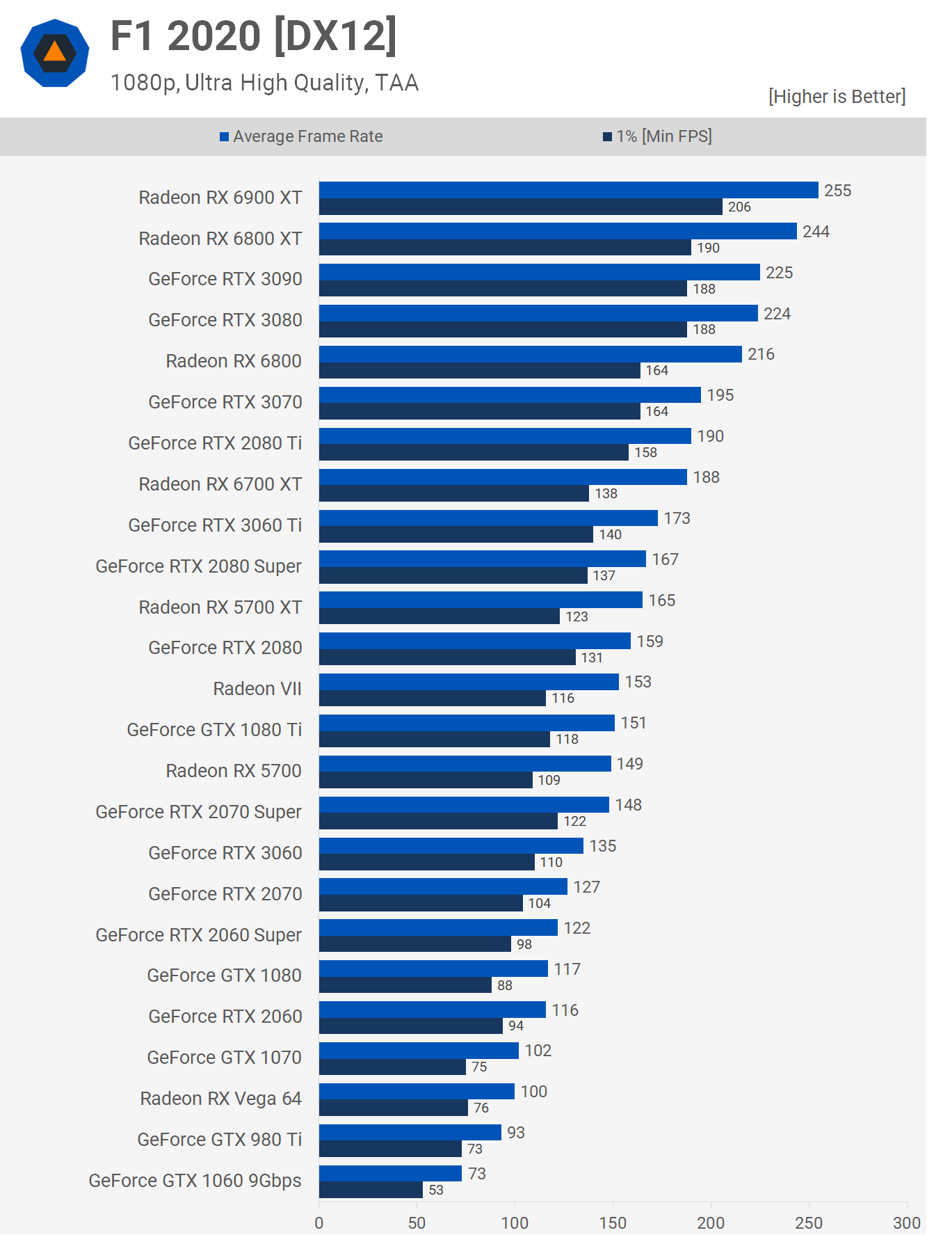 The F1 2020 results are quite disappointing, especially considering how well other Radeon GPUs perform. The 6900 XT can be seen beating the RTX 3090, the 6800 XT can beat the RTX 3080, and the 5700 XT easily beat the RTX 2060 Super.