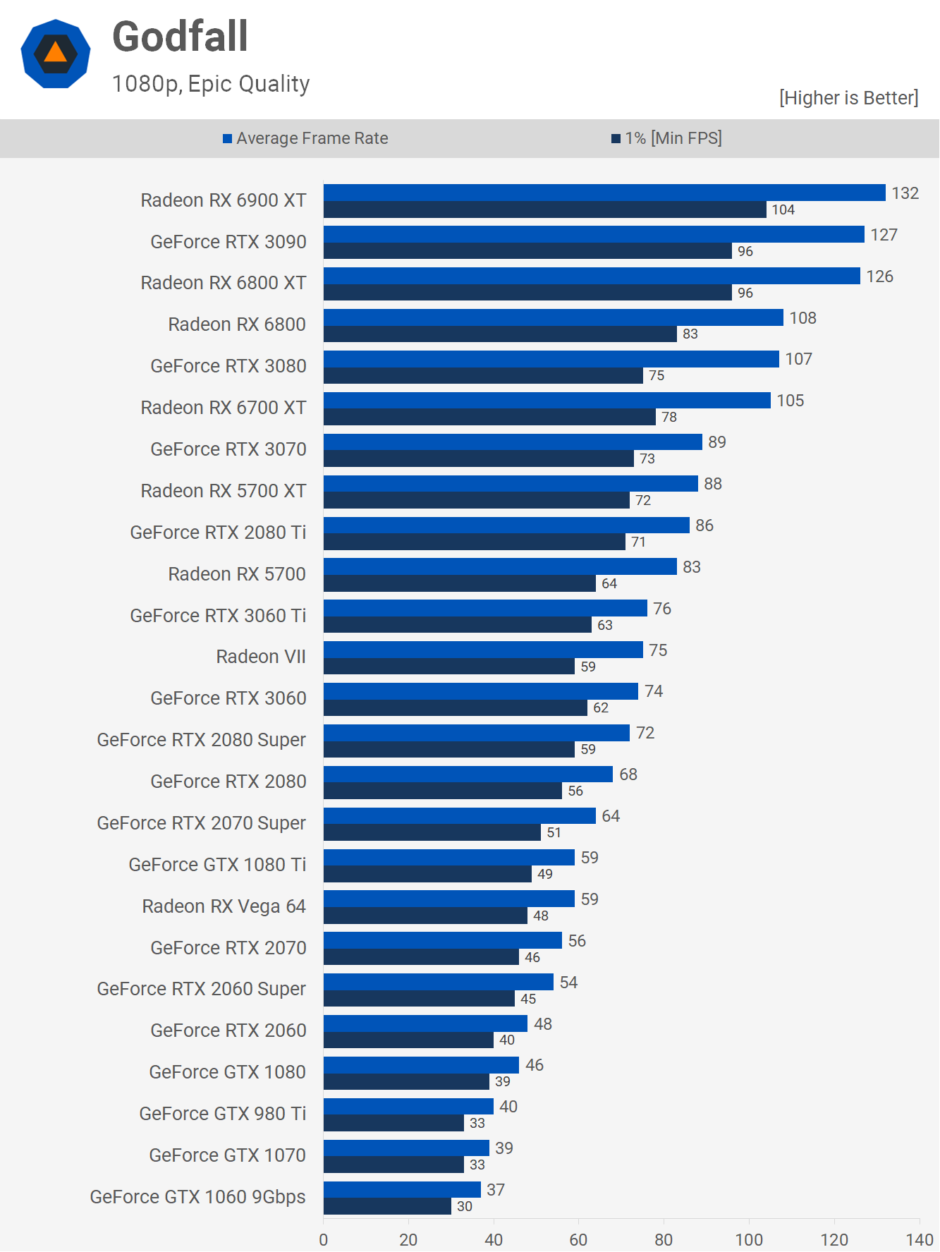 Godfall is an AMD-sponsored title that's well-optimized for Radeon GPUs. As a result, the 6700 XT is able to blow away the RTX 3070, offering 17% greater performance at least when comparing the average frame rate. The 1% low performance was actually very similar.