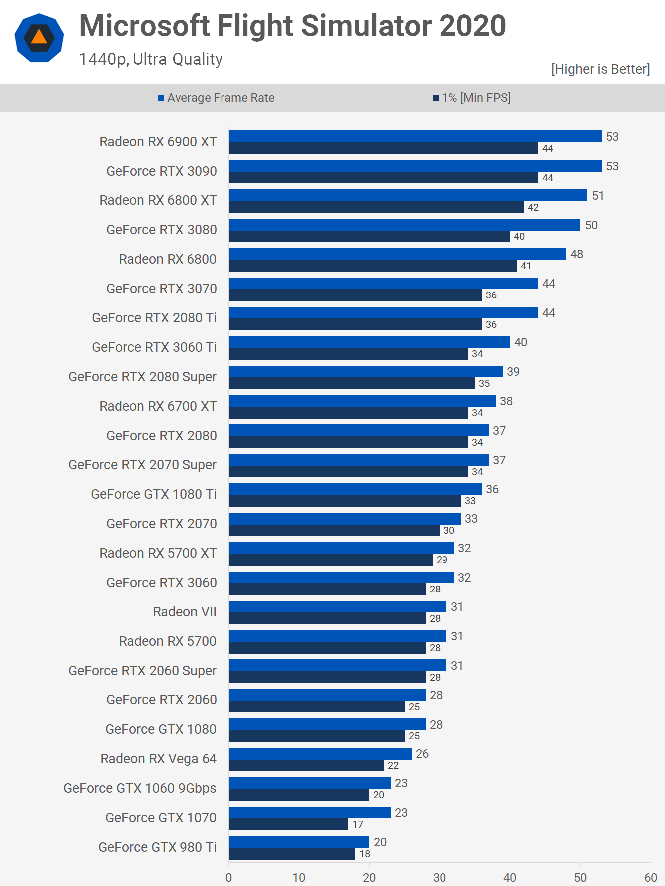 Moving on to Microsoft Flight Simulator 2020, we find that the 6700 XT isn't all that impressive here, trailing the 6800 by a 21% margin as it drops down from 48 fps to just 38 fps. That means it's also 14% slower than the RTX 3070 and even 5% slower than the 3060 Ti. Perhaps even more disappointing was that it's just 19% faster than the 5700 XT.