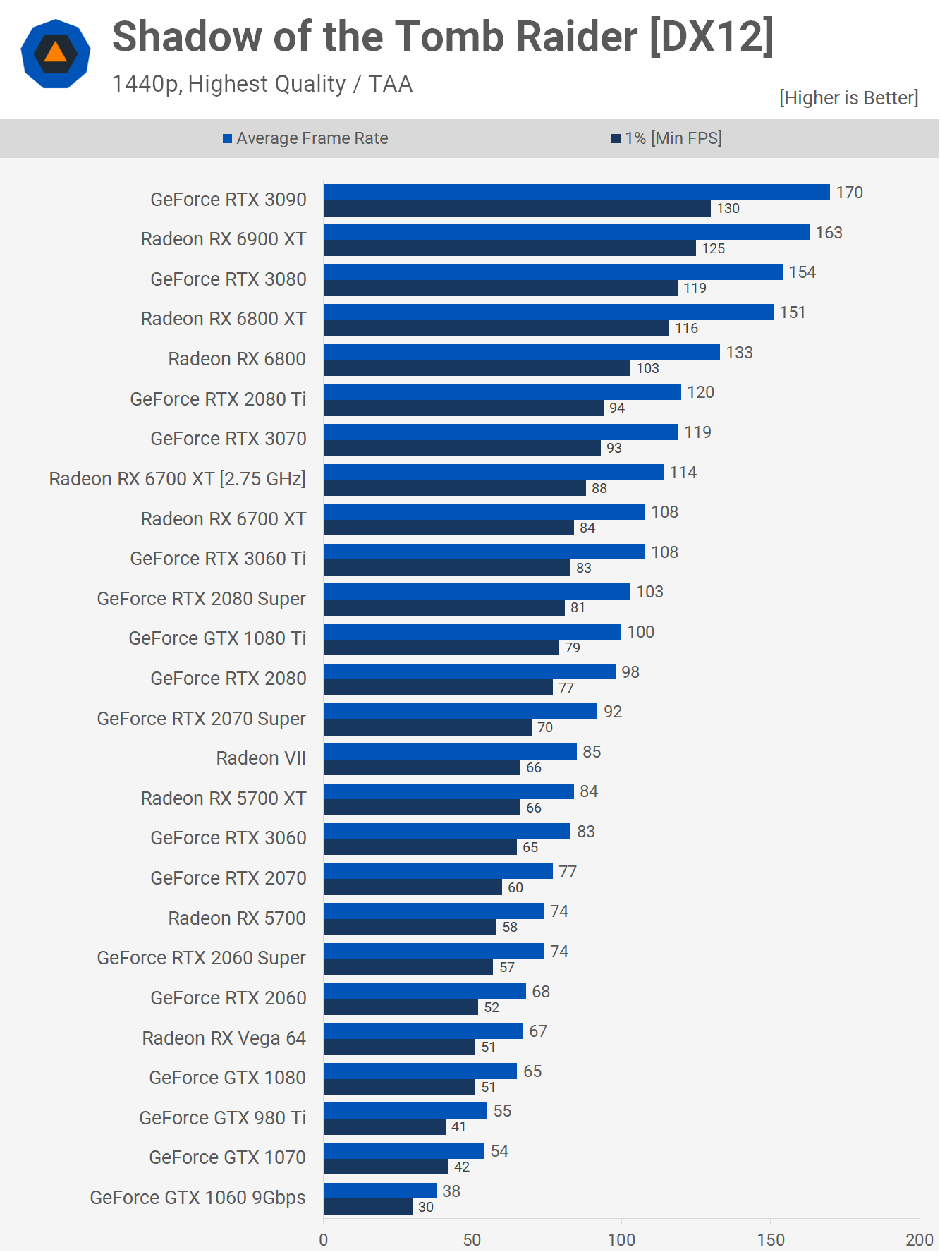 Performance in Shadow of the Tomb Raider is also disappointing. Here the 6700 XT is only able to match the cheaper RTX 3060 Ti, making it 9% slower than the RTX 3070 and 19% slower than the 6800. It does offer nearly 30% performance than the old 5700 XT.