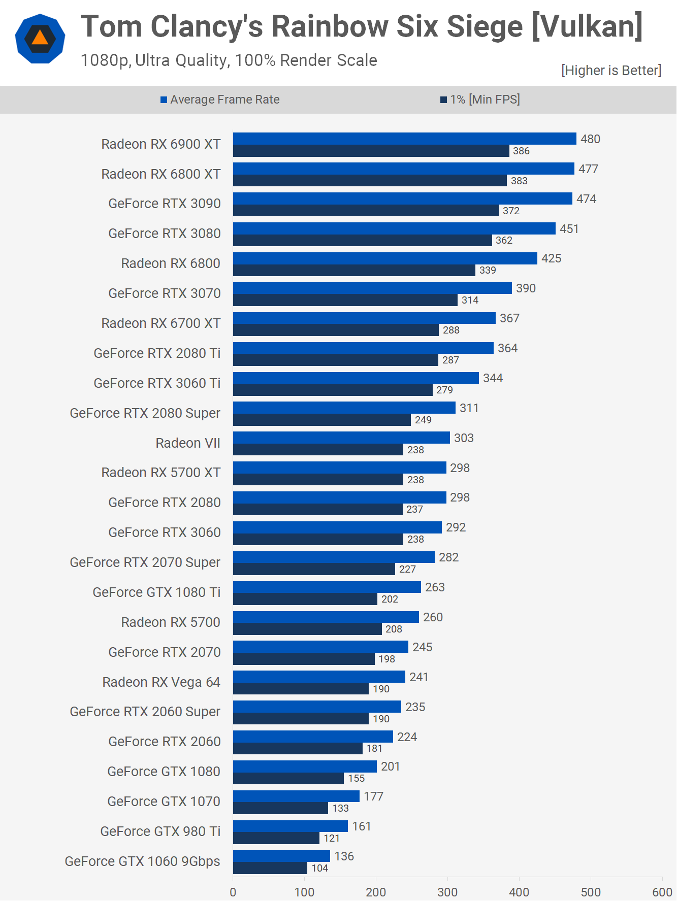 The 6700 XT also struggles to keep pace with the RTX 3070 in Tom Clancy's Rainbow Six Siege, this time it's 10% slower and again was more comparable with the 3060 Ti, beating it by a mere 2.5% margin. When compared to the RX 6800, we're looking at a 19% performance loss and when compared to the 5700 XT, a 28% performance gain.