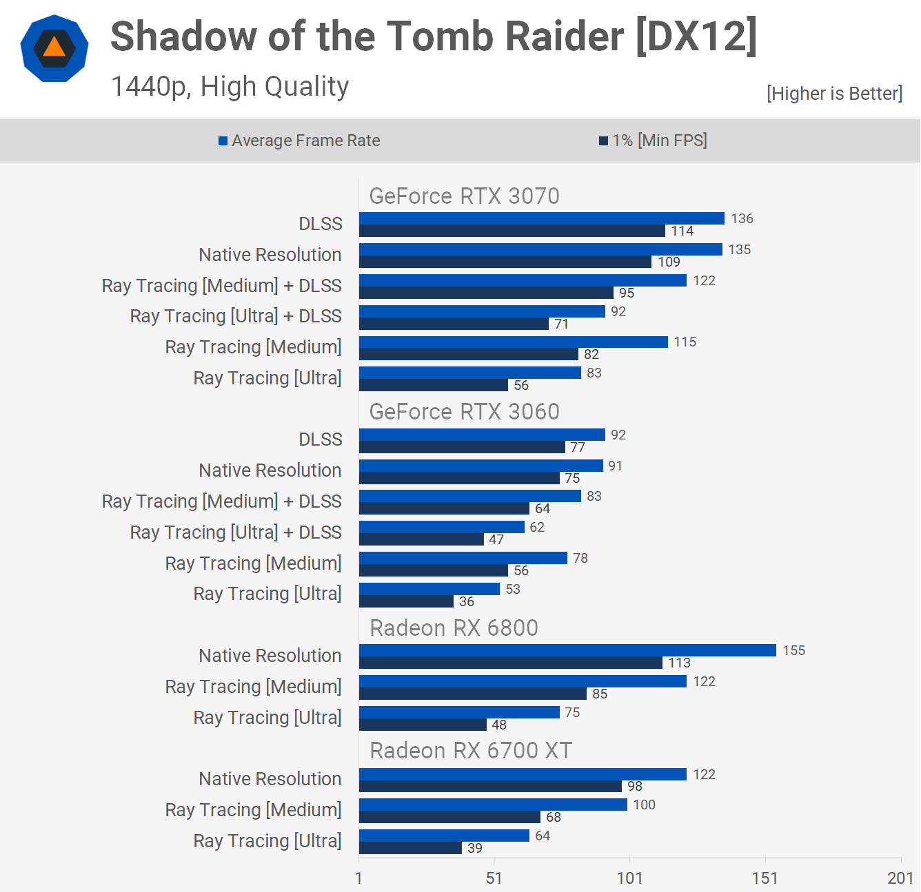 Ray tracing performance in Shadow of the Tomb Raider is much better, though we're only using RT to enhance shadows, so it's rather pointless in our opinion. Anyway, using the ultra quality setting the 6700 XT manages 64 fps on average, or 23% slower than the RTX 3070 and 30% slower with DLSS enabled.