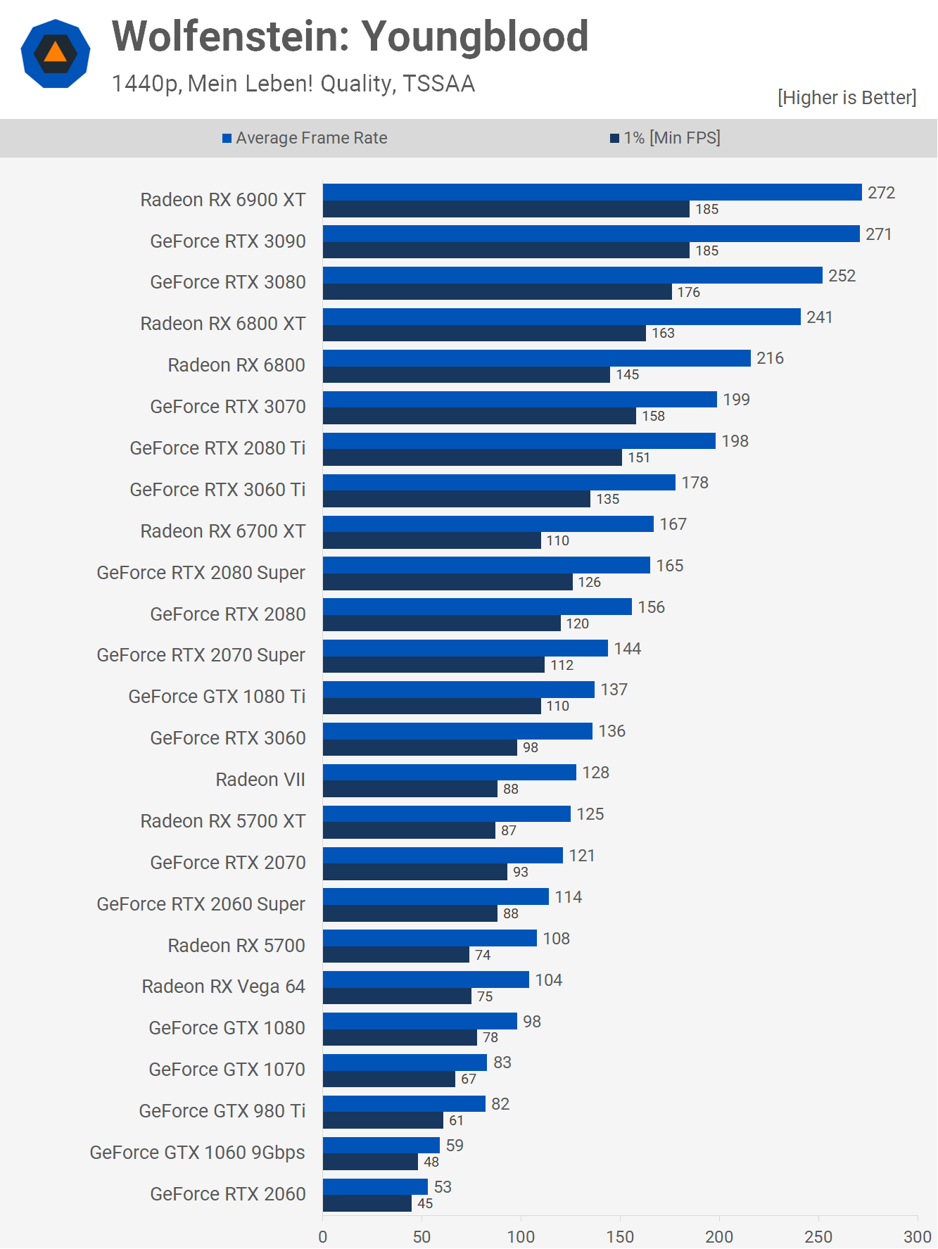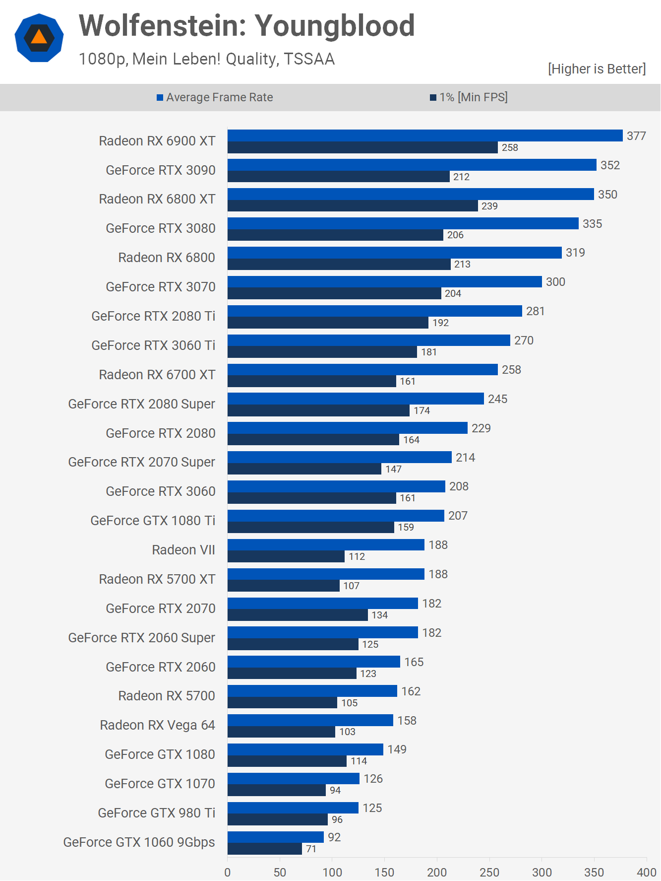 Now here's a look at performance in a title sponsored by Nvidia. Wolfenstein Youngblood doesn't let the 6700 XT have its best showing, losing to the RTX 3070 by a 16% margin and even the 3060 Ti by a 6% margin. It's also 23% slower than the 6800, though it was 34% faster than the 5700 XT, so a pretty good result relative to the older Radeon part.