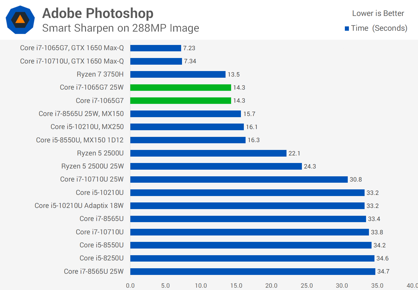 What about another good result for Ice Lake? In Adobe Photoshop's Iris Blur filter we see strong performance out of the Core i7-1065G7. This CPU is 8 percent faster than the 10710U and 17 percent faster than the 10510U, which is a really strong showing. While this isn't a single-threaded test, it's quite memory intensive given the size of the photo we're working with, so I believe we're seeing good gains from the massive improvement to memory bandwidth we get thanks to Ice Lake's new memory controller.