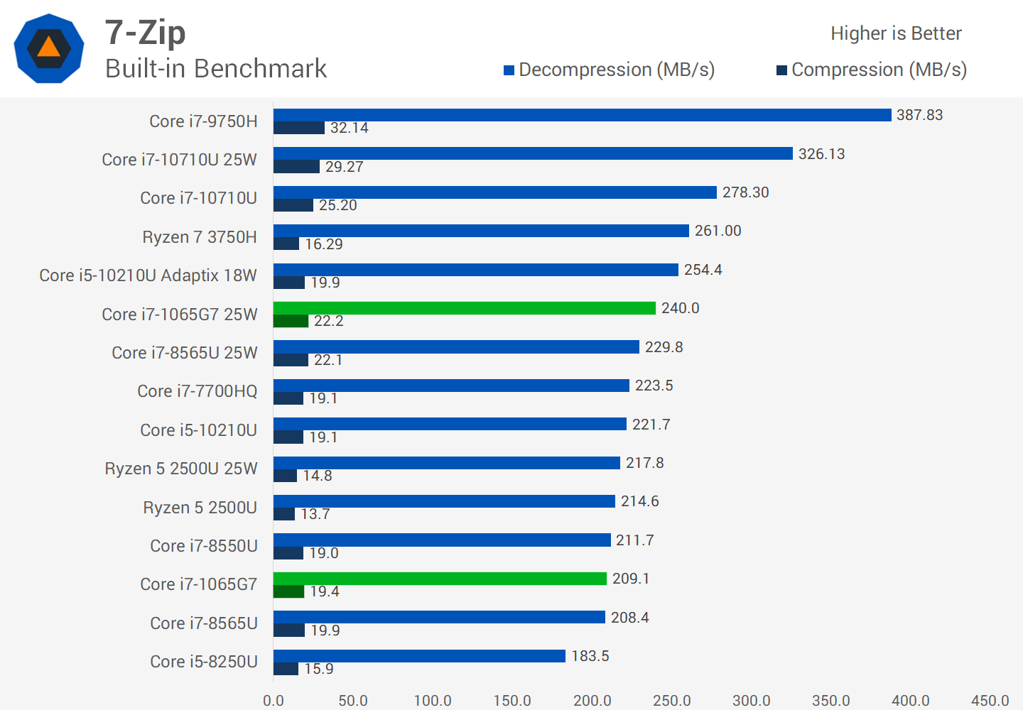 7-zip continues the story we've been showing for a while now. Even though this is a short workload, it's multi-threaded, and the 1065G7 ends up falling behind the Core i5-10210U. The margins aren't huge, all within single digits for most of these 10nm vs 14nm quad core comparisons, but still not that impressive.