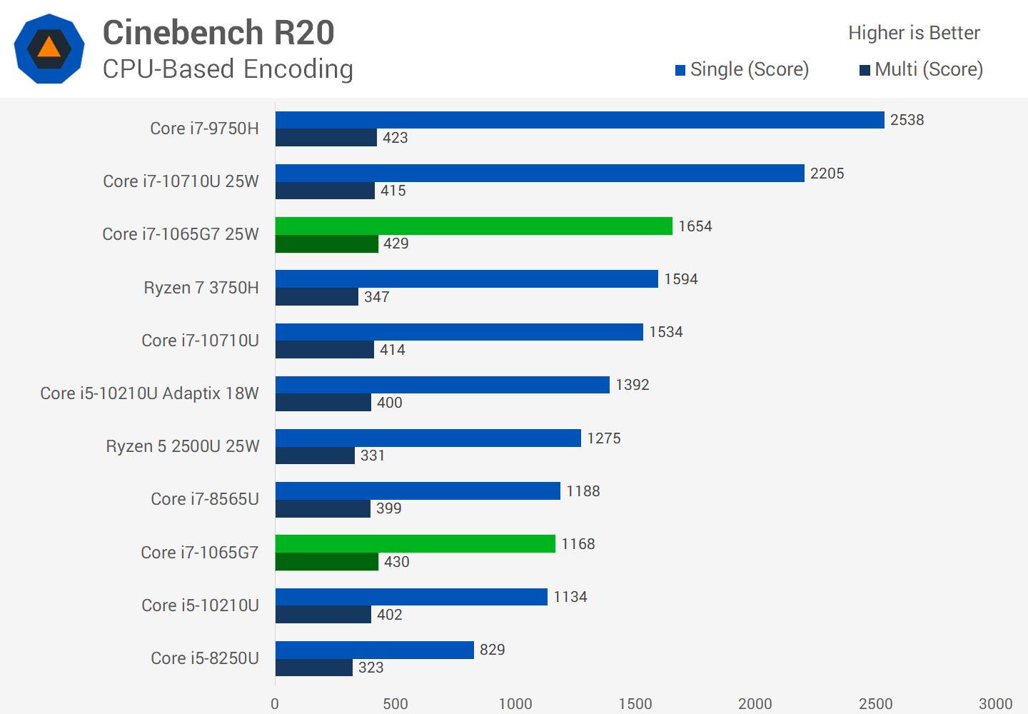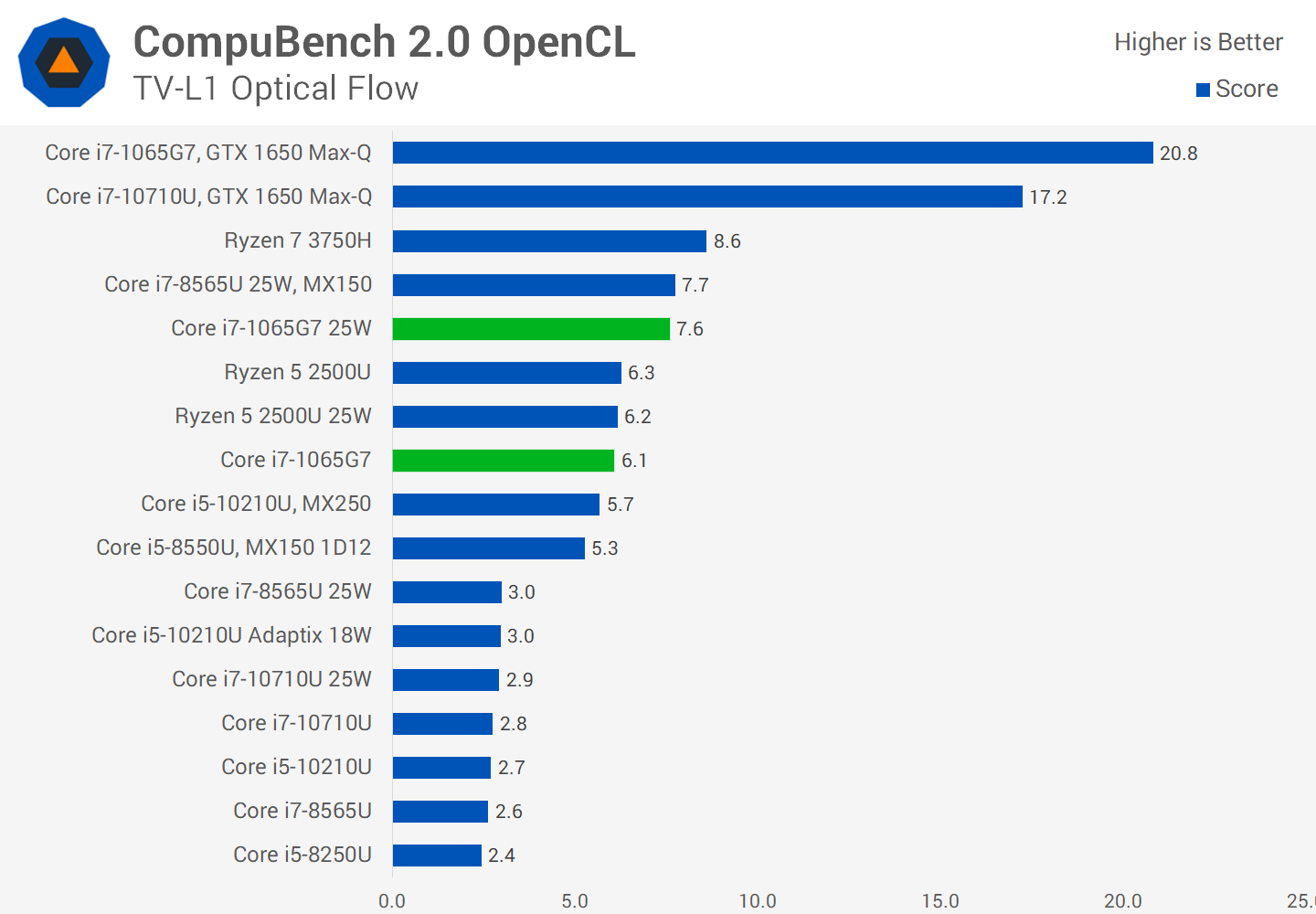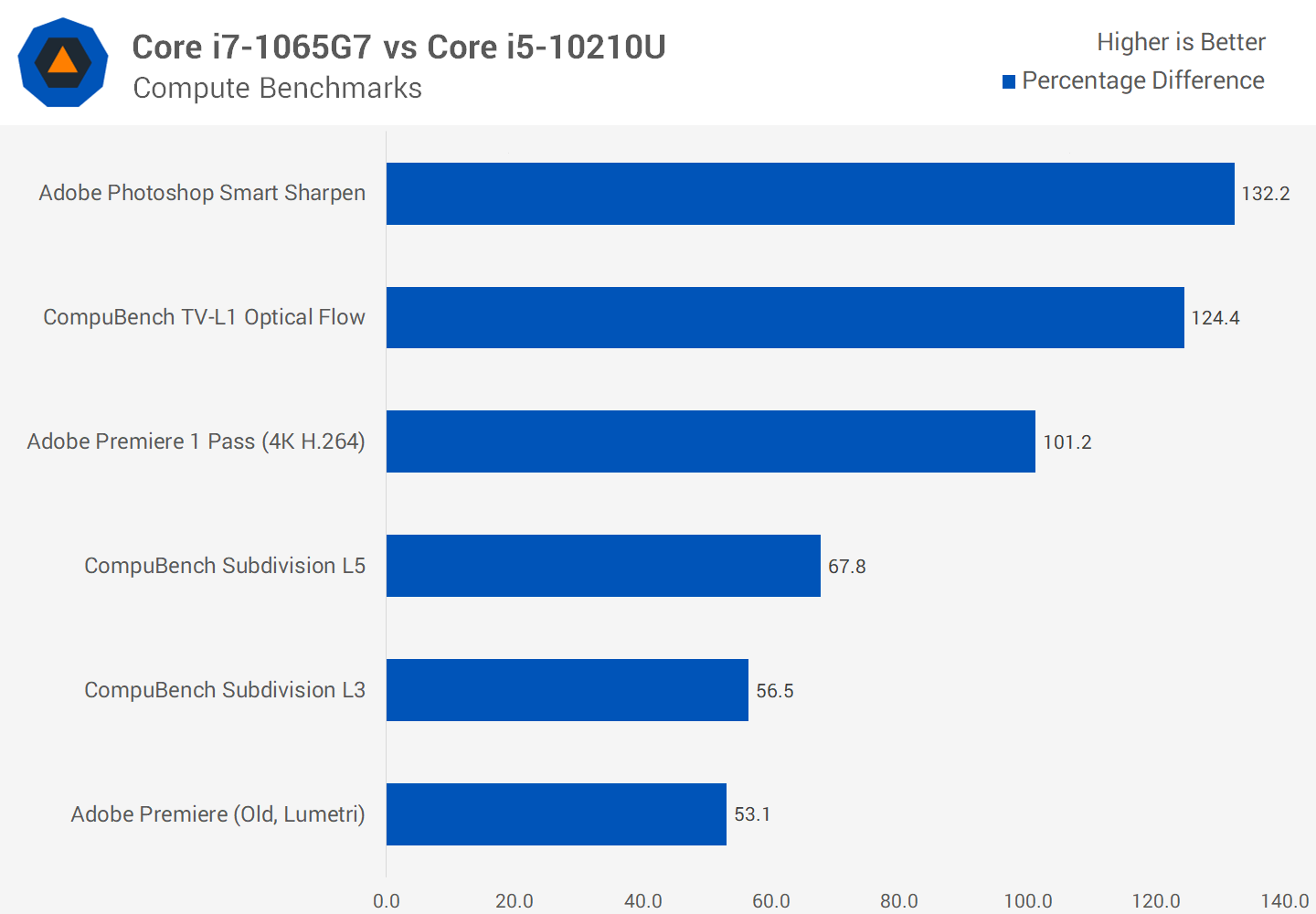 In its stock configuration with no dedicated GPU, the Core i7-1065G7 outperforms most other configurations, including the Core i5-10210U with an MX250 GPU. It also demolishes 14nm parts: 75% faster than the i7-10710U, and more than twice as fast as the i5-10210U, all thanks to huge GPU gains.