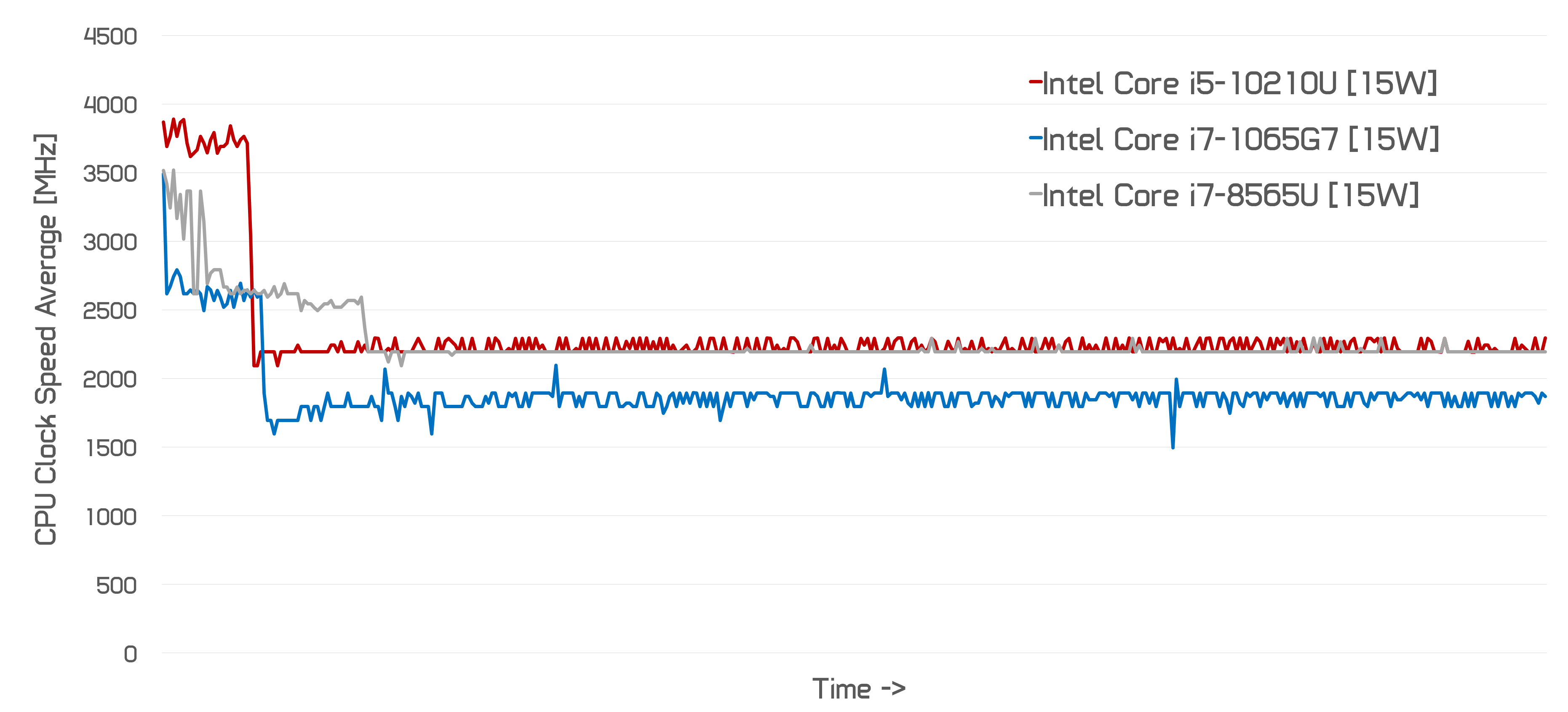 Looking at clock speeds, there aren't too many surprises given our rated clock speed discussion earlier. Like all 15W CPUs, under a sustained Cinebench run, clock speeds are well below the maximum all-core turbo frequency so power consumption doesn't exceed 15W. The 14nm Core i5-10210U sits between 2.2 and 2.3 GHz all-core in this run, while the 10nm Core i7-1065G7 drops down to 1.8 to 1.9 GHz.