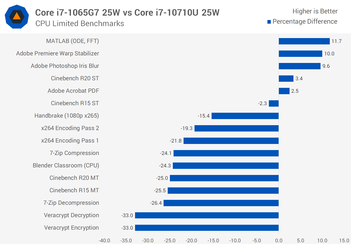 And it's similar comparing the Core i7-1065G7 to the Whiskey Lake Core i7-8565U. There are some larger than expected gains for workloads like MATLAB and Photoshop Iris Blur, but in longer tests like Handbrake, Ice Lake actually clocks in slower. On average, the i7-1065G7 is a few percent faster but it's not a mindblowing difference and certainly in these CPU limited workloads, there's not much of a reason to upgrade from any of the 8th-generation parts or newer.