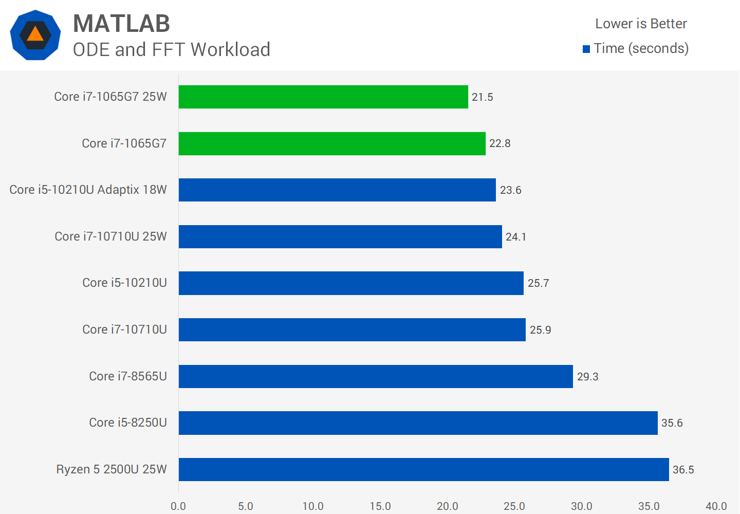 Few more workloads to go, this time our brand new MATLAB benchmark which is a real world usage of differential equations and fast Fourier transforms, which are common tasks people perform in this engineering tool. This workload hits just a few threads and also can be quite memory and cache intensive, so with Ice Lake seeing gains in these areas, MATLAB performance is higher than other 10th-generation parts. 13 percent gains here over 10th-gen is very decent.