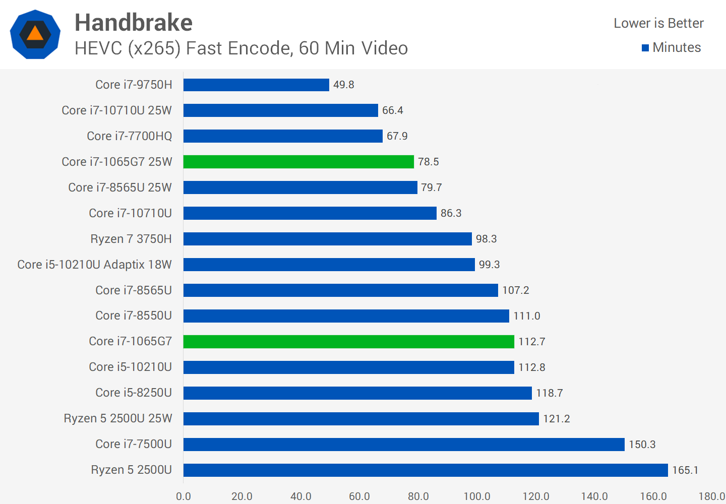 Handbrake is where the boys get separated from the men, as this multiple hour long benchmark really stresses the long term steady state performance of these chips. Again, when constrained to 15W, there's really no advantage to CPU performance here over previous generation parts. We're about 23 percent slower than the 10710U, while the higher clocked Core i7-8565U actually outperforms the 1065G7 by a few minutes.