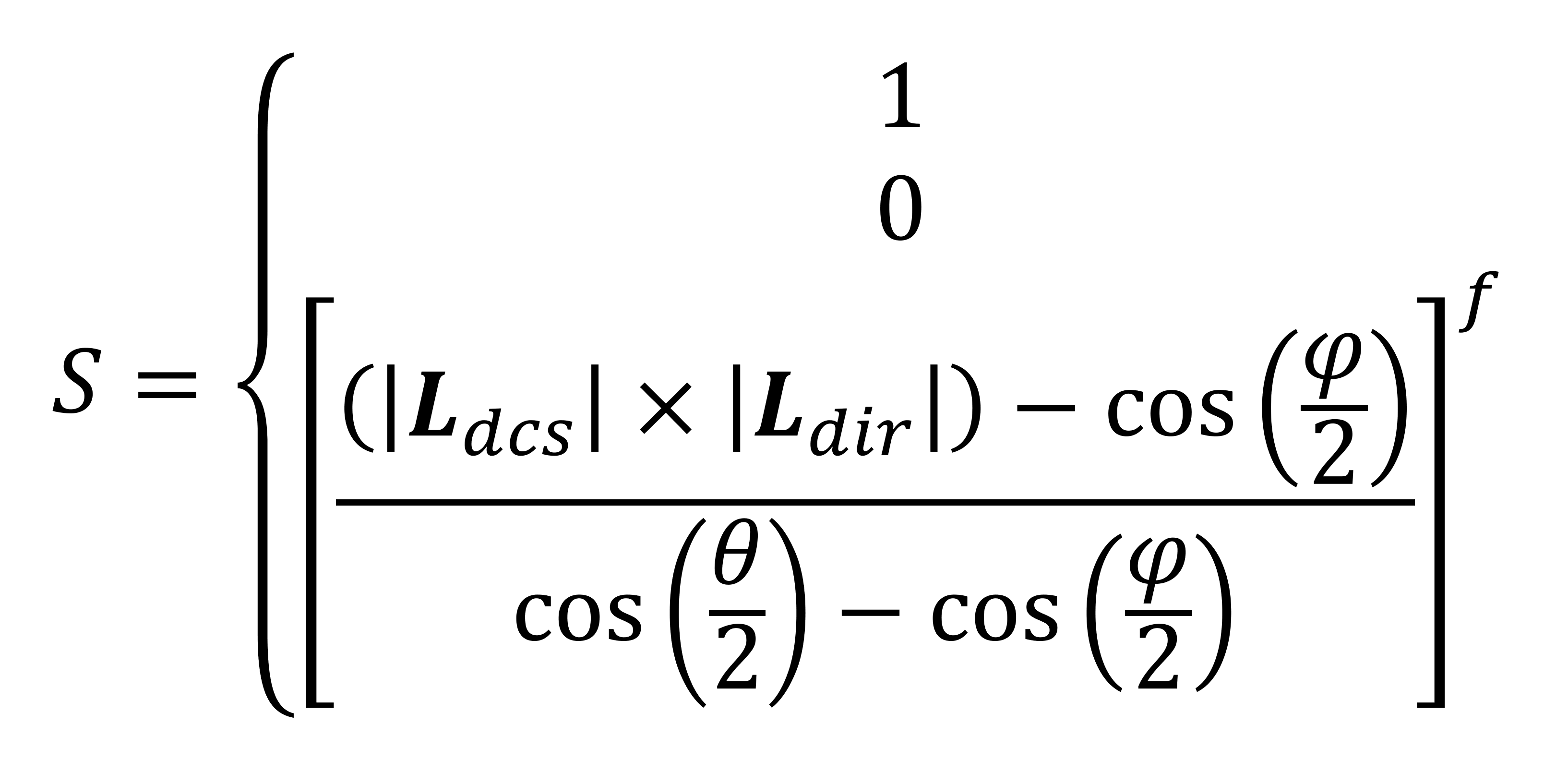 The value for the spotlight factor is either 1 (i.e. the light isn't a spotlight), 0 (if the vertex falls outside of the cone's direction), or some calculated value between the two. The angles φ (phi) and θ (theta) set out the sizes of the inner/outer sections of the spotlight's cone.