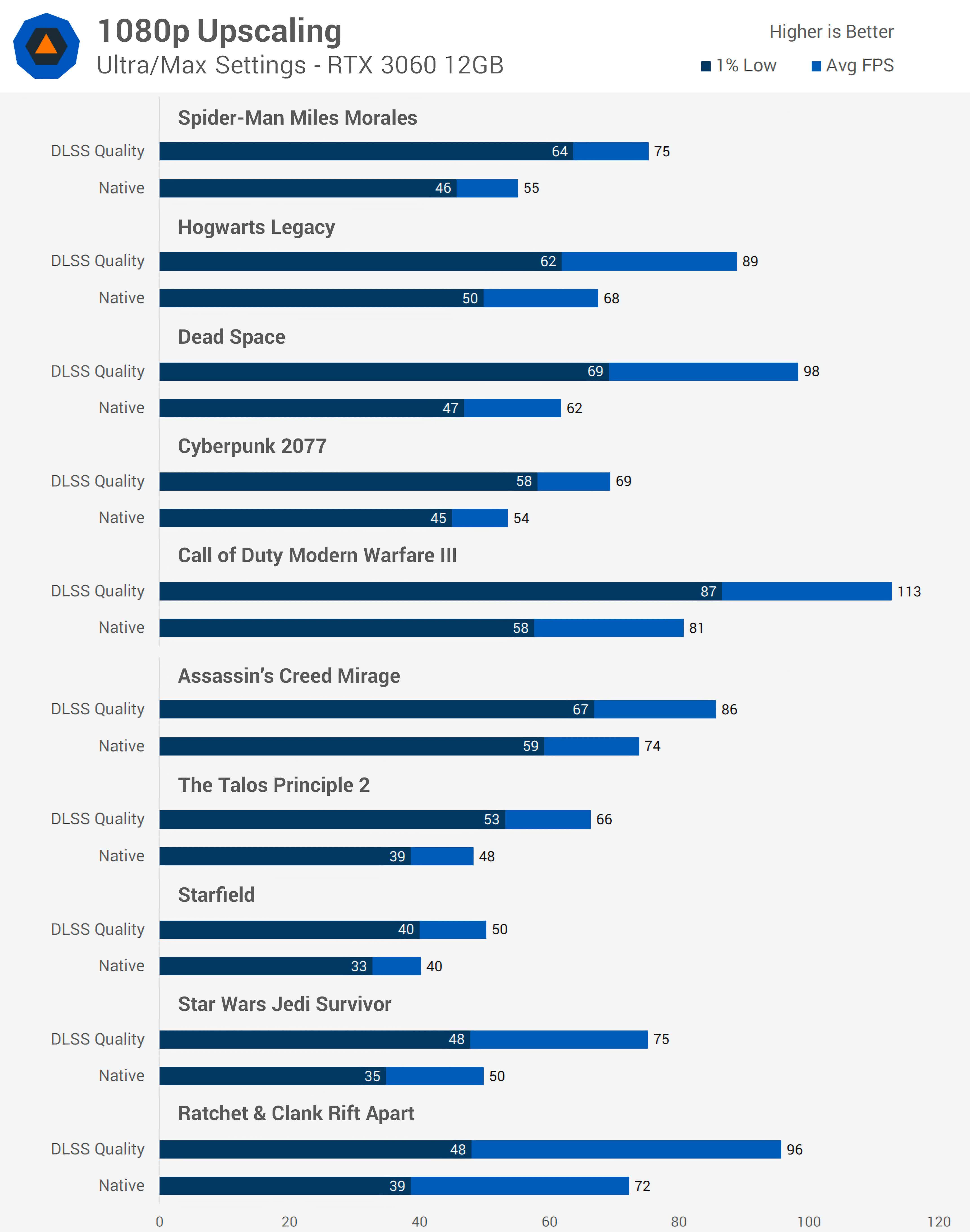 On average, DLSS Quality delivered a 36% performance improvement across these 10 games compared to native rendering at 1080p on the RTX 3060 gaming (average FPS), along with a 32% improvement to 1% lows. Using this average, it means a given game that runs at 60 FPS using native rendering improves to around 82 FPS using DLSS Quality, or if the baseline performance is 40 FPS, performance would end up around 54 FPS.